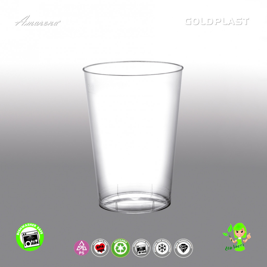 Opakované použitie a možnosť umývania v umývačke (350 cyklov), perfektná kvalita, luxusný dizajn, 100% recyklovateľné, nerozbitné plastové poháre s možnosťou vlastnej potlače.