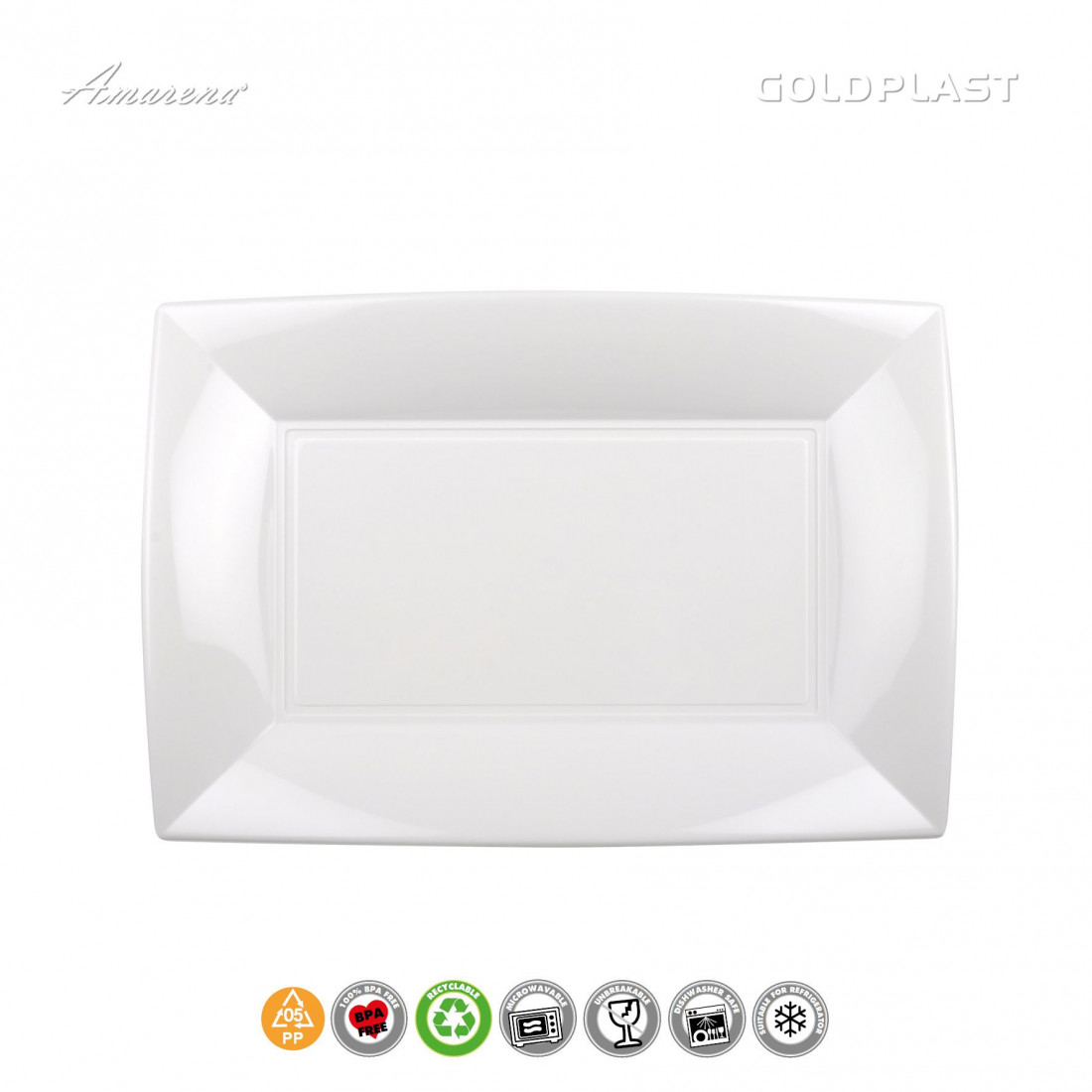 Moderné plastové taniere na hlavné jedlo alebo chuťovky, veľký rozmer 34x23cm. Dlhodobé použitie, min. 125 umývacích cyklov v umývačke riadu. Vhodné do mikrovlnky, mrazničky, použitie + 120°C – 20 °C. Tieto kvalitné plastové taniere využijete napr. na záhradej párty, grilovačke, na oslave a pod. Sú BPA free, recyklovateľné. Taliansky dizajn, vyrobené v EÚ. Veľkoobchod/maloobchod