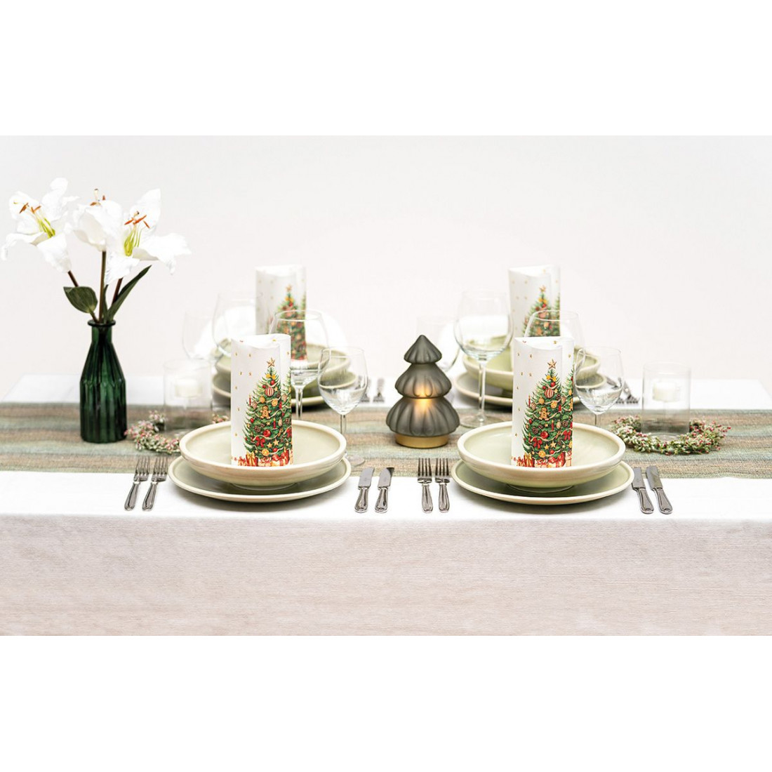 Servítky na Vianoce Tannenbaum dodajú Vášmu vianočne vyzdobenému stolu hrejivú a slávnostnú atmosféru. Biely podklad a zeleno-červený vianočný motív sa skvele hodia, ak plánujete červenú, zelenú, zlatú alebo bielu vianočnú výzdobu. Nezabudnite na stredovú šerpu na stôl v zlatej, červenej alebo olivovej farbe a počas krátkej chvíľku vykúzlite nezabudnuteľné vianočné prestieranie.