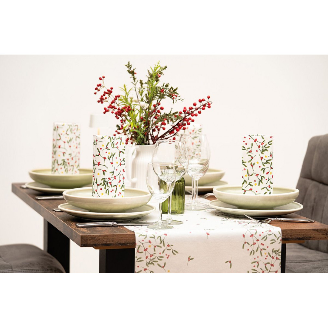 Nalaďte sa do vianočnej atmosféry s našimi vianočnými servítkami Leni. Vianoce budú tak krásne! Vianočné imelo je ako pozvánka na vianočnú večeru. Nezabudnite na behúň na stôl v rovnakom dizajne a vytvorte si dokonalé vianočné prestieranie.